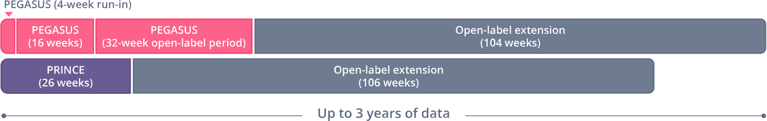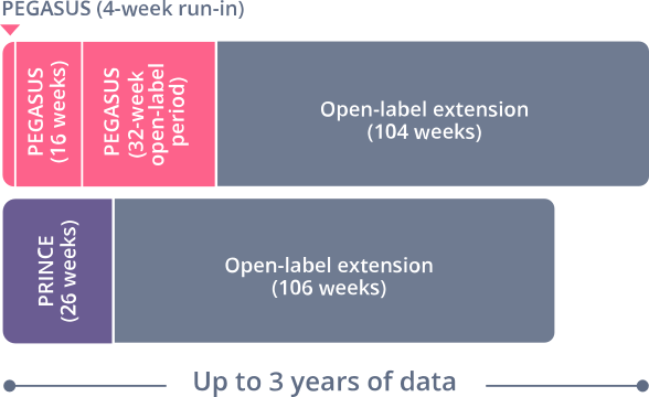 Long-term data presented reflect the subset of patients who received 1080 mg of EMPAVELI by subcutaneous infusion twice weekly or every 3 days for up to 3 years (2.5 years, PRINCE; 3 years, PEGASUS).