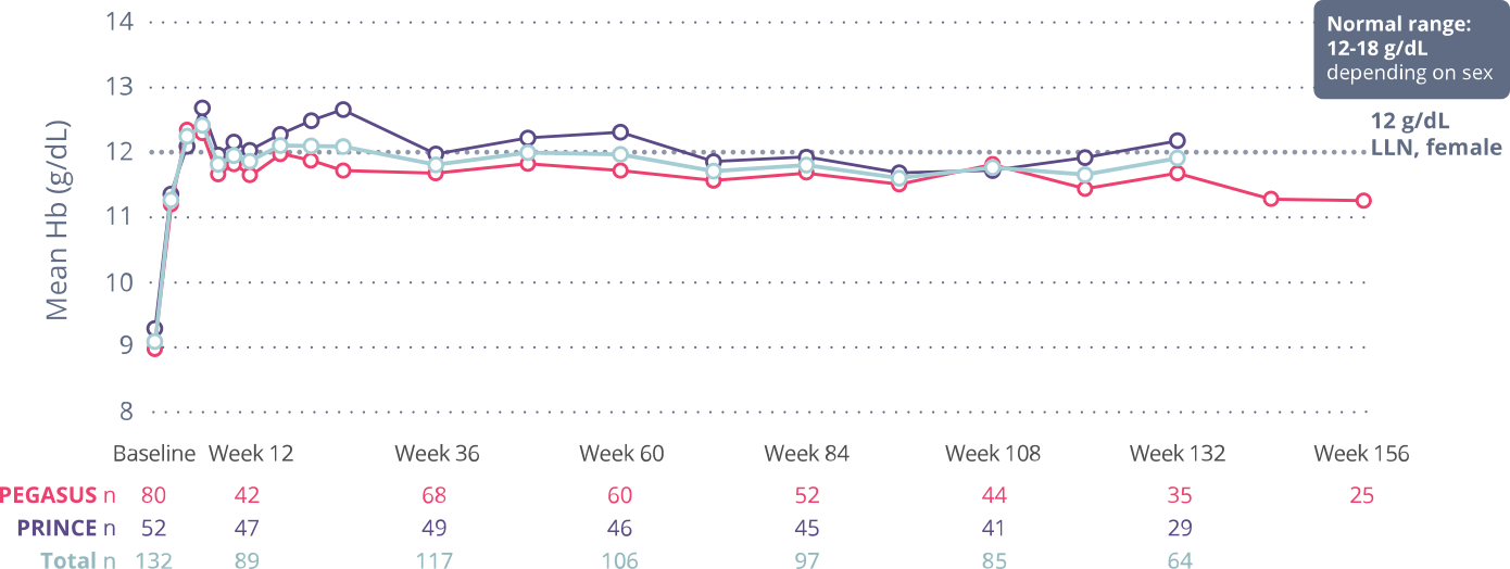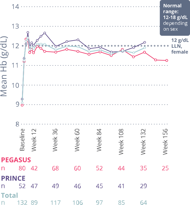 Original inclusion criteria were baseline Hb <10.5 g/dL despite ≥3 months of stable eculizumab dosing (PEGASUS) or naïve to complement inhibitors with Hb <LLN (13.6 g/dL for males, 12.0 g/dL for females) (PRINCE) at screening.