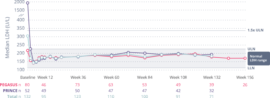 • The analysis included a mixed patient population—C5i-experienced (PEGASUS) and complement inhibitor-naïve (PRINCE). Findings may not represent all people with PNH