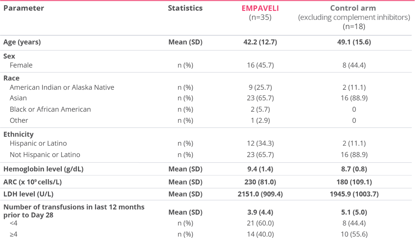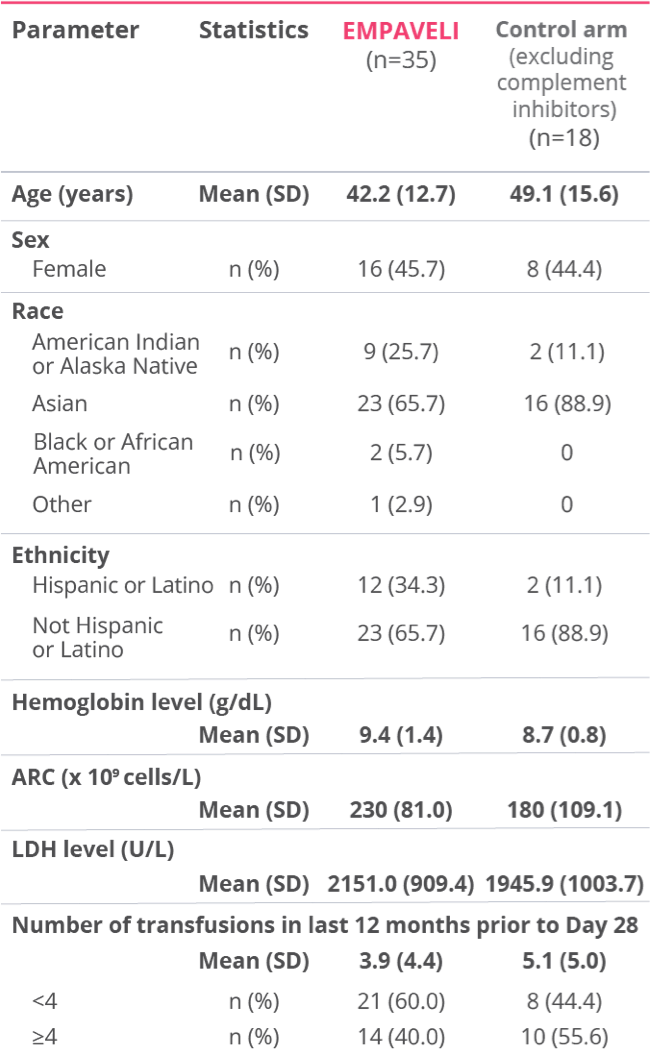 References: 1. EMPAVELI [prescribing information]. Waltham, MA: Apellis Pharmaceuticals, Inc.; 2025. 2. Hillmen P, Szer J, Weitz I, et al. Pegcetacoplan versus eculizumab in paroxysmal nocturnal hemoglobinuria. N Engl J Med. 2021;384:1028-1037. 3. Data on file. Apellis Pharmaceuticals, Inc., Waltham, MA.